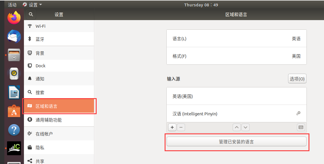 选择中文安装,安装后,回到区域和语言页面,点击语言,选择汉语: