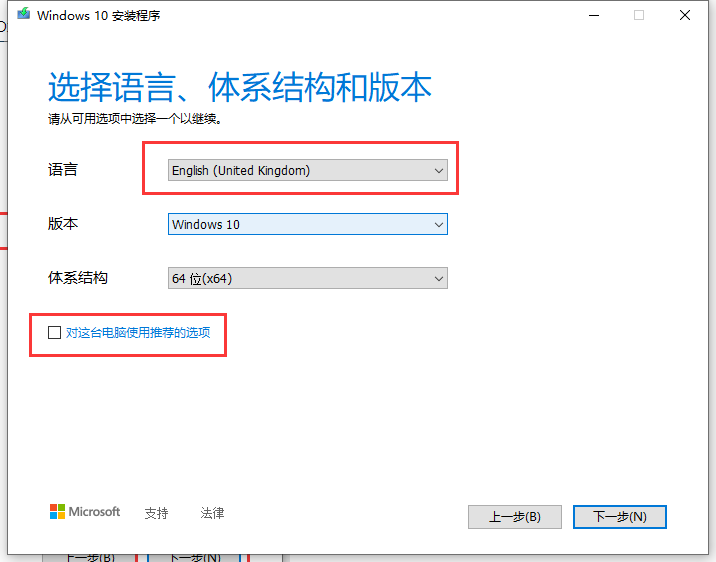 不要勾选下面的“对这台电脑使用推荐的选项”框,上面语言选择“English(United Kingdom)”或者其它欧洲国家的语言都可以。